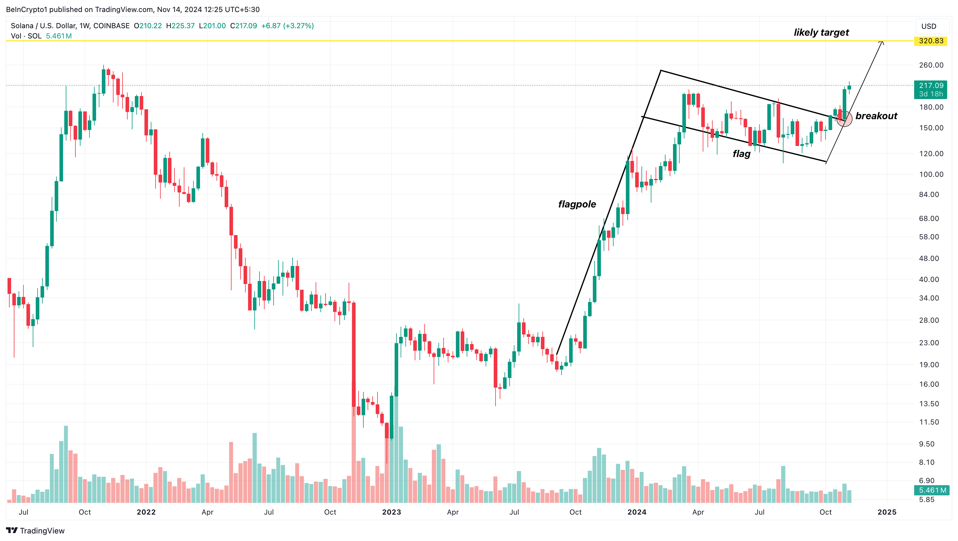 Etter den siste utviklingen brøt Solana ut av et okseflagg på det ukentlige diagrammet. Et okseflagg er et mønster kjennetegnet av to oppadgående rallyer, med en kort konsolideringsperiode imellom. Mønsteret starter med et bratt prisstigning (flaggstangen) ettersom kjøpere overvelder selgere, etterfulgt av en tilbaketrekning som danner parallelle øvre og nedre trendlinjer, som skaper “flagget”.