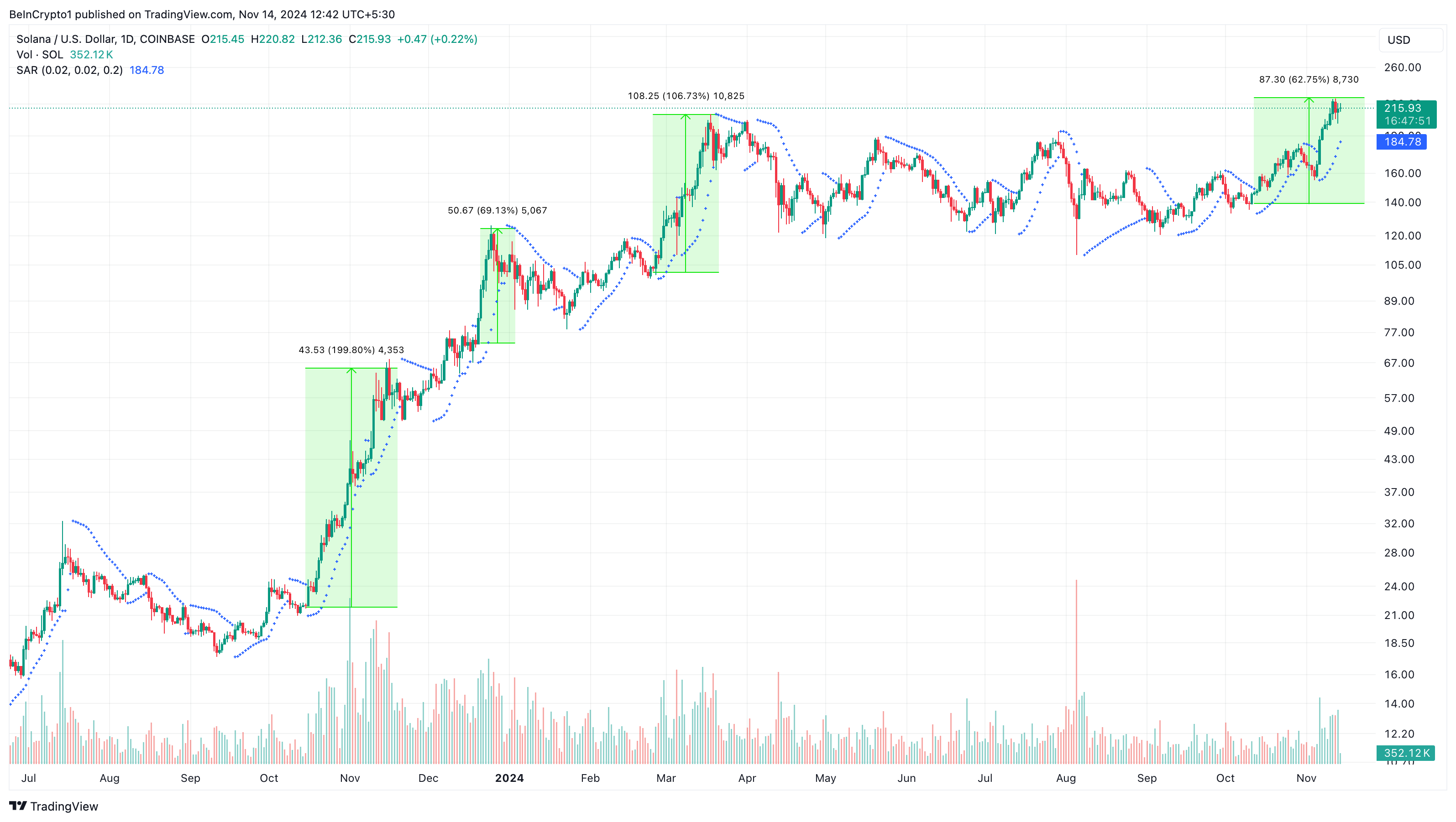 Samtidig viser en annen titt på det daglige diagrammet at Solana-gjennombruddet sannsynligvis vil fortsette. Den parabolske Stop and Reverse (SAR)-indikatoren antyder dette.