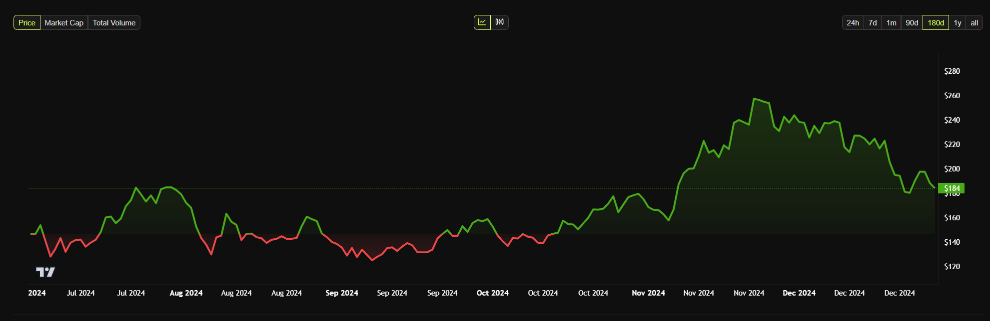 Totalt sett, i 2024, økte altcoinen med over 70 % og nådde en all-time high på $ 263 i november. Dens vekst har blitt drevet av økningen i transaksjoner og aktivitet, spesielt rundt meme coins. Denne veksten førte til at Solana ble den nest største blokkjeden etter TVL etter Ethereum.