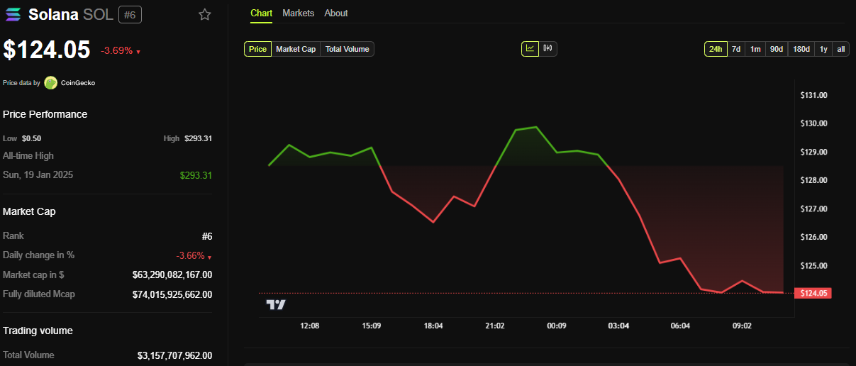 Midt i denne motreaksjonen falt Solanas drivende token nesten 4 % i løpet av de siste 24 timene. BeInCrypto-data viser at SOL ble handlet for $ 124,05 i skrivende stund.