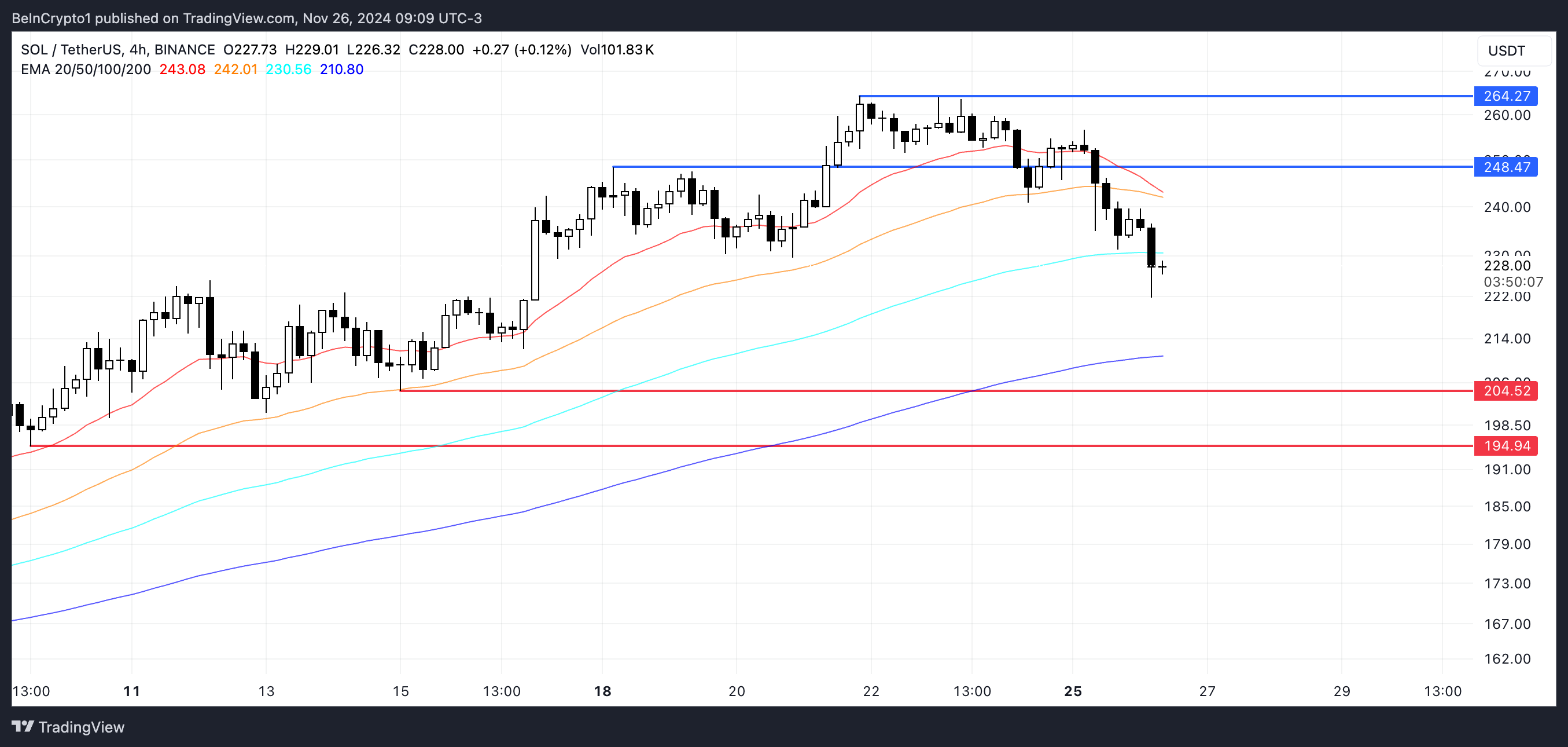 Solana (SOL) kurs nådde en all-time high på $ 264 den 22. november, men har siden gått inn i en korreksjon, og falt nesten 10 % det siste døgnet. Indikatorer som BBTrend og DMI viser økende bearish momentum.