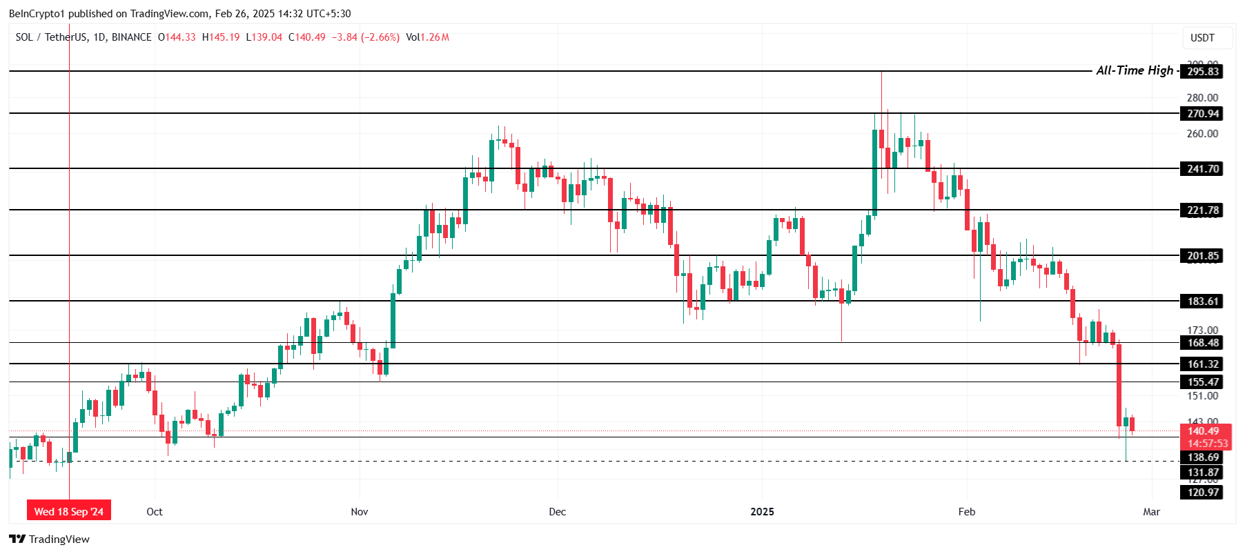 Solana handles for tiden til $ 140, og holder seg over det avgjørende støttenivået på $ 138. Imidlertid har den nylige nedgangen fra $ 168 til sitt 5-måneders lavpunkt gjort en rask oppgang stadig mer tvilsom. Dette prisfallet har tatt investorer på sengen, og selv om det ennå ikke har brutt under $ 138, forblir utsiktene bearish.