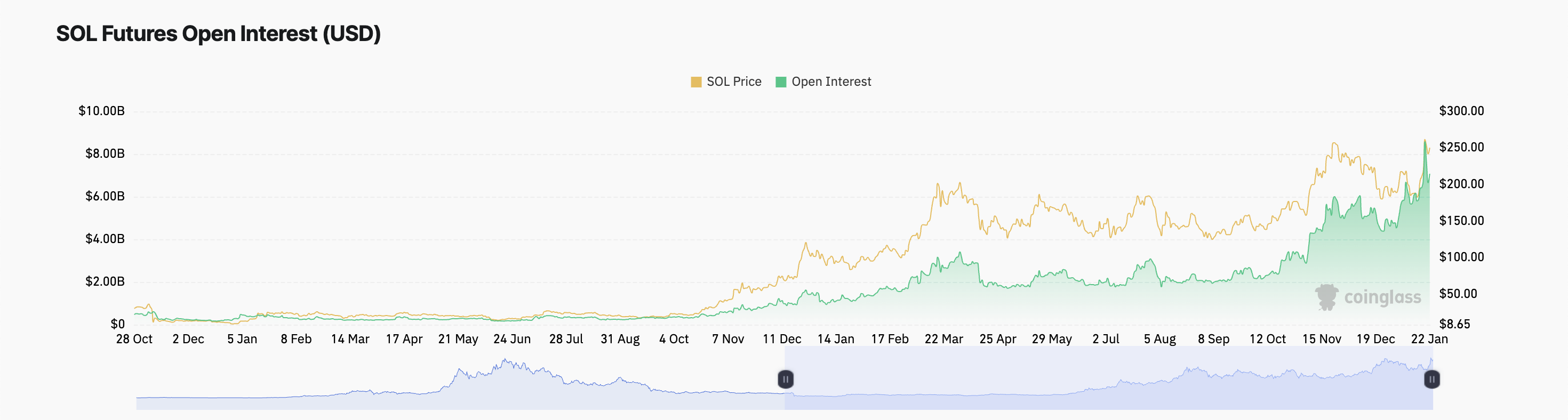Solana (SOL) har falt 14 % fra sin all-time high på $ 295,83, nådd 19. januar. Til tross for nedgangen, forblir bullish sentiment sterkt ettersom markedsdeltakere reduserer gevinstsikring.