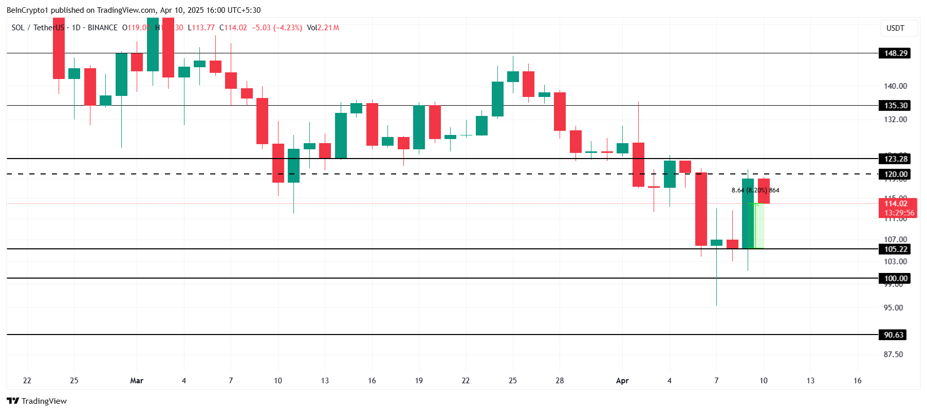 Solanas pris har steget med 8,2 % de siste 24 timene, og handles til $ 114. Selv om den viser tegn til oppgang, forblir altcoinen under den viktige psykologiske prisen på $ 120. Utover det ligger en avgjørende motstand på $ 123, som har vist seg utfordrende de siste dagene.