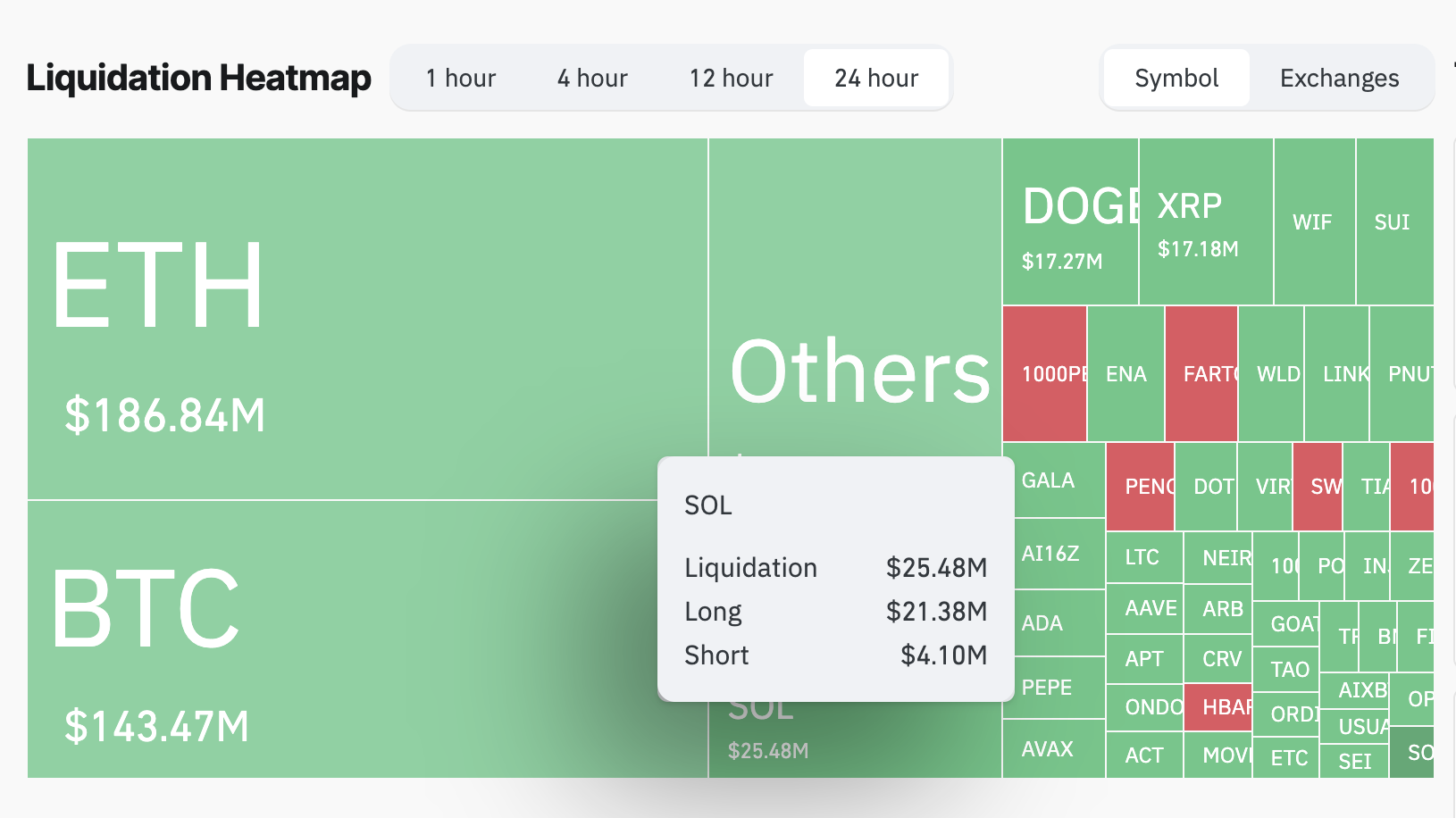 Ifølge Coinglass har de totale likvidasjonene i Solana-markedet nådd $ 25,48 millioner de siste 24 timene, med long-likvidasjoner som utgjør $ 21,38 millioner og short-likvidasjoner som totalt $ 4,10 millioner.