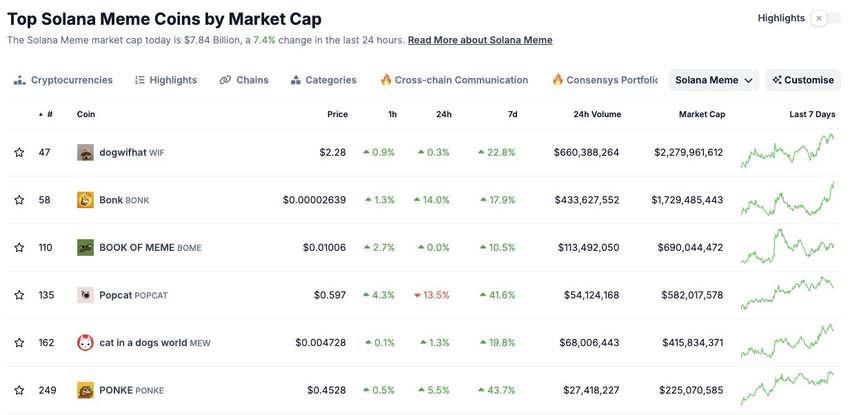 CoinMarketCap 2024 H1-rapporten ble meme-mynter merket som den mest populære aktivaklassen, noe som representerer en andel på 22 % av markedet. I løpet av de siste åtte månedene har Solana (SOL) økosystemet ledet diagrammene, etterfulgt av Ethereum (ETH) og kunstig intelligens (AI) tokens.