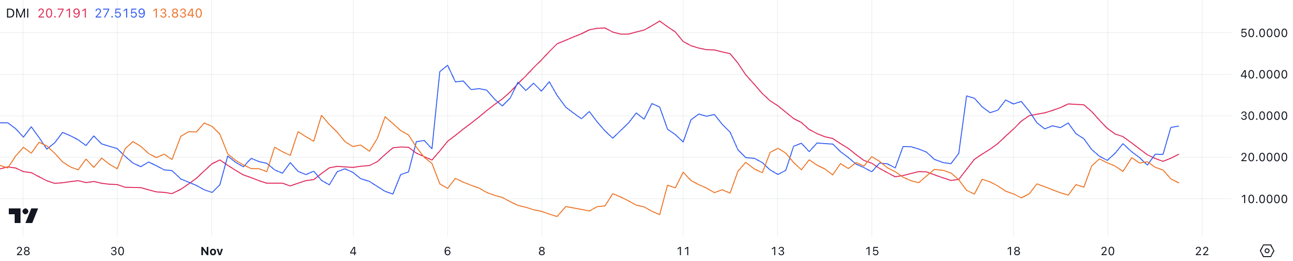 Med den positive retningsindeksen (D+) på 27,5 og den negative retningsindeksen (D-) på 13,8, fortsetter bullish press å overgå bearish aktivitet.