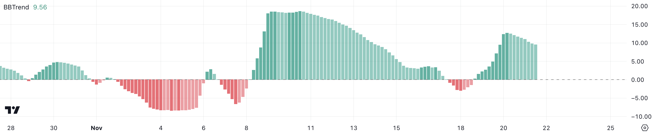 BBTrend måler styrken og retningen av prisbevegelser ved bruk av Bollinger Bands, med positive verdier som signaliserer en opptrend og negative verdier som indikerer en nedtrend.