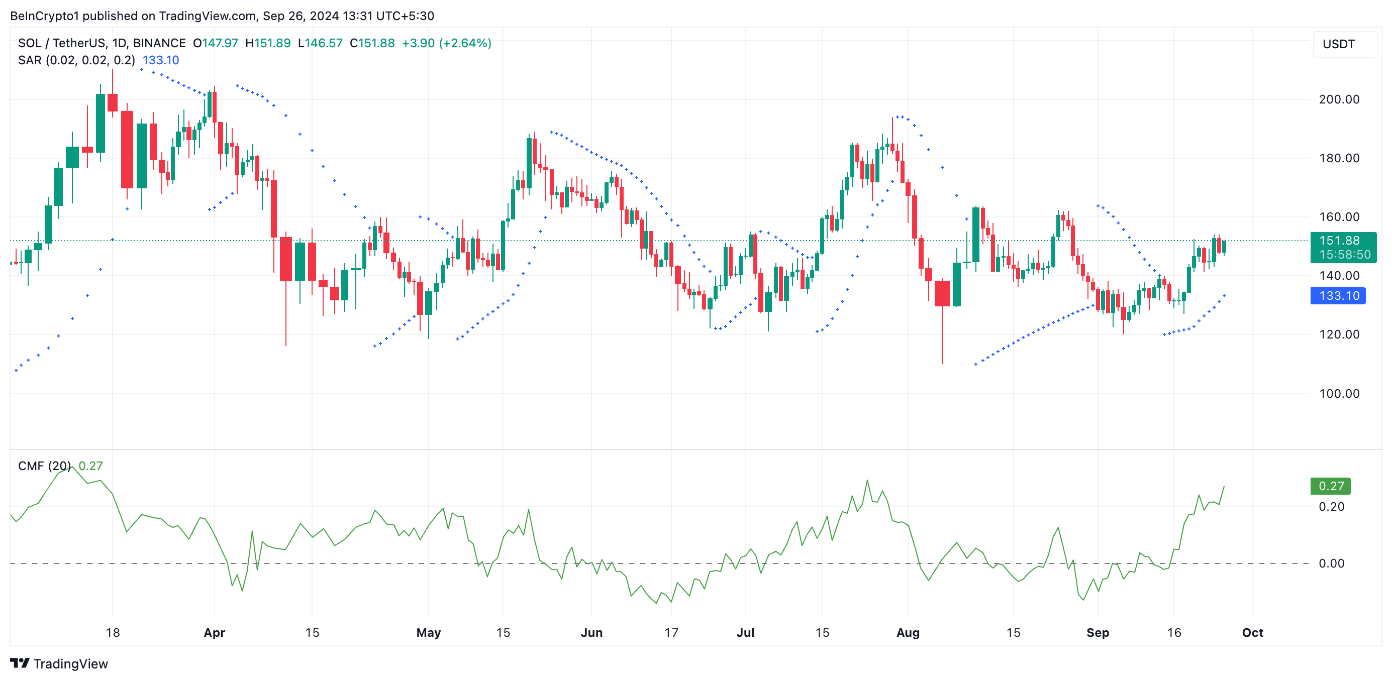 Til tross for dette, dominerer fortsatt bullish indikatorer. Parabolic Stop and Reverse (SAR)-indikatoren, med sine punkter under SOLs pris, signaliserer en sterk oppadgående trend. I tillegg indikerer Chaikin Money Flow (CMF), som for øyeblikket er på 0,27, høyt kjøpepress, noe som tyder på at markedets bullish holdning til Solana fortsatt er intakt, i det minste for nå.
