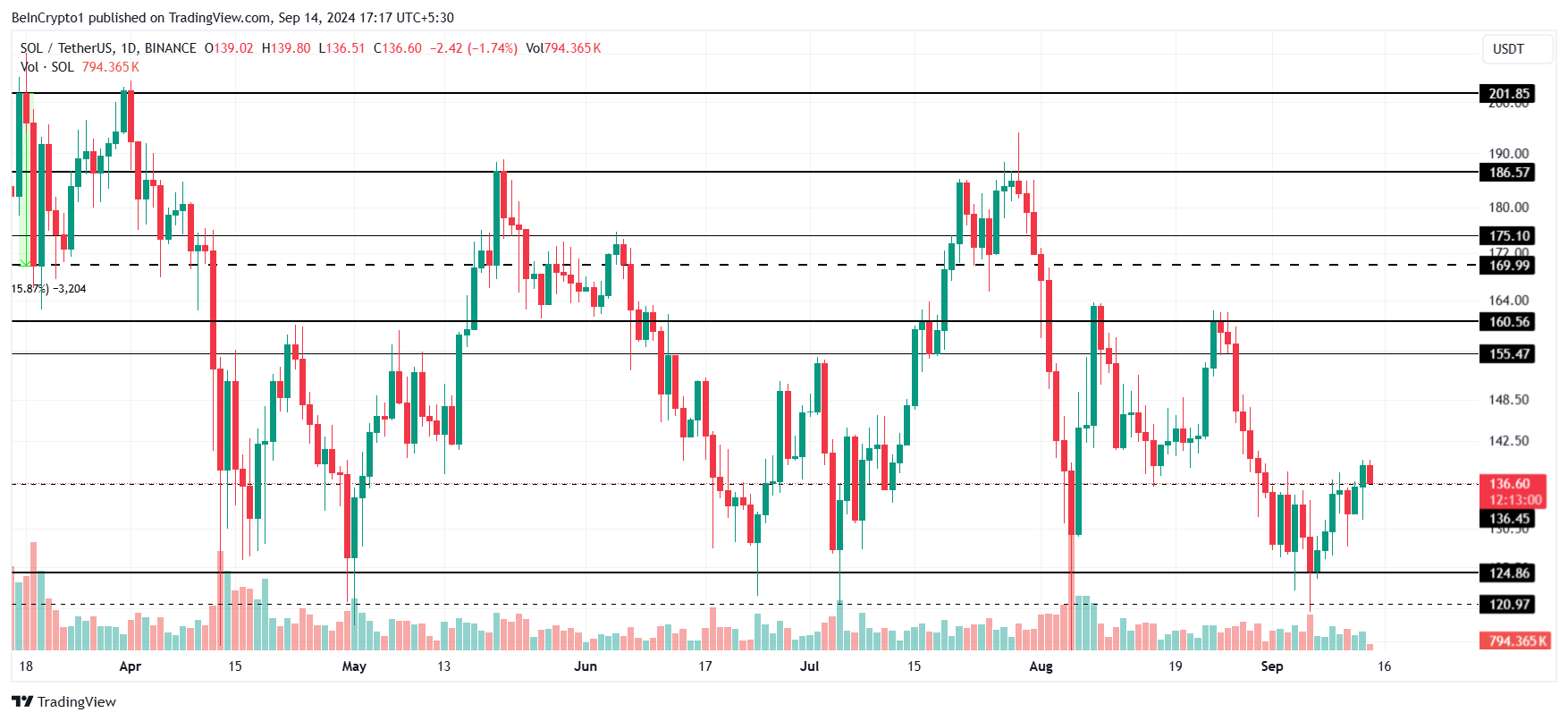 Solanas pris forsøker for tiden å gjøre $ 136-nivået til en sterk støttesone, etter å ha steget opp mot $ 124. Hvis dette lykkes, kan det gi nødvendig momentum for å skyve SOL oppover mot det kritiske motstandsnivået på $ 160.