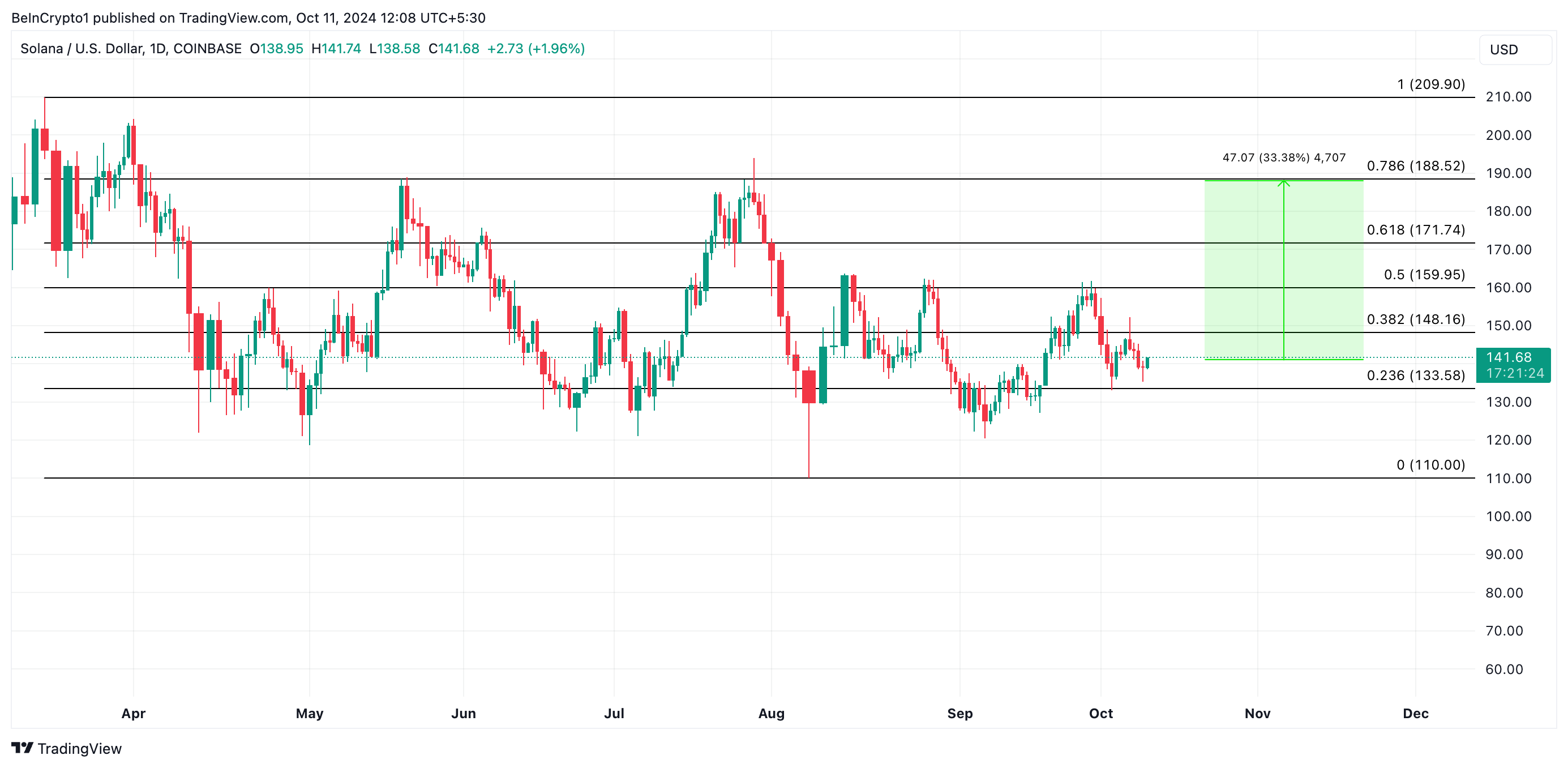 I følge Fibonacci Retracement-avlesninger er SOL posisjonert for en økning, og potensielt nå $ 188,52 hvis nettverksengasjementet fortsetter å vokse.