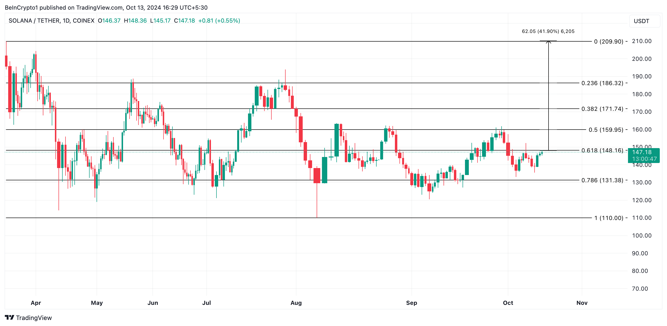 Denne oppadgående trenden har ført SOL til et nøkkelmotstandsnivå på $ 148,16, som den nå forsøker å bryte. Hvis Solana klarer å overgå denne motstanden, kan det utløse en oppgang mot $ 210 og videre. Men hvor snart kan dette gjennombruddet skje?