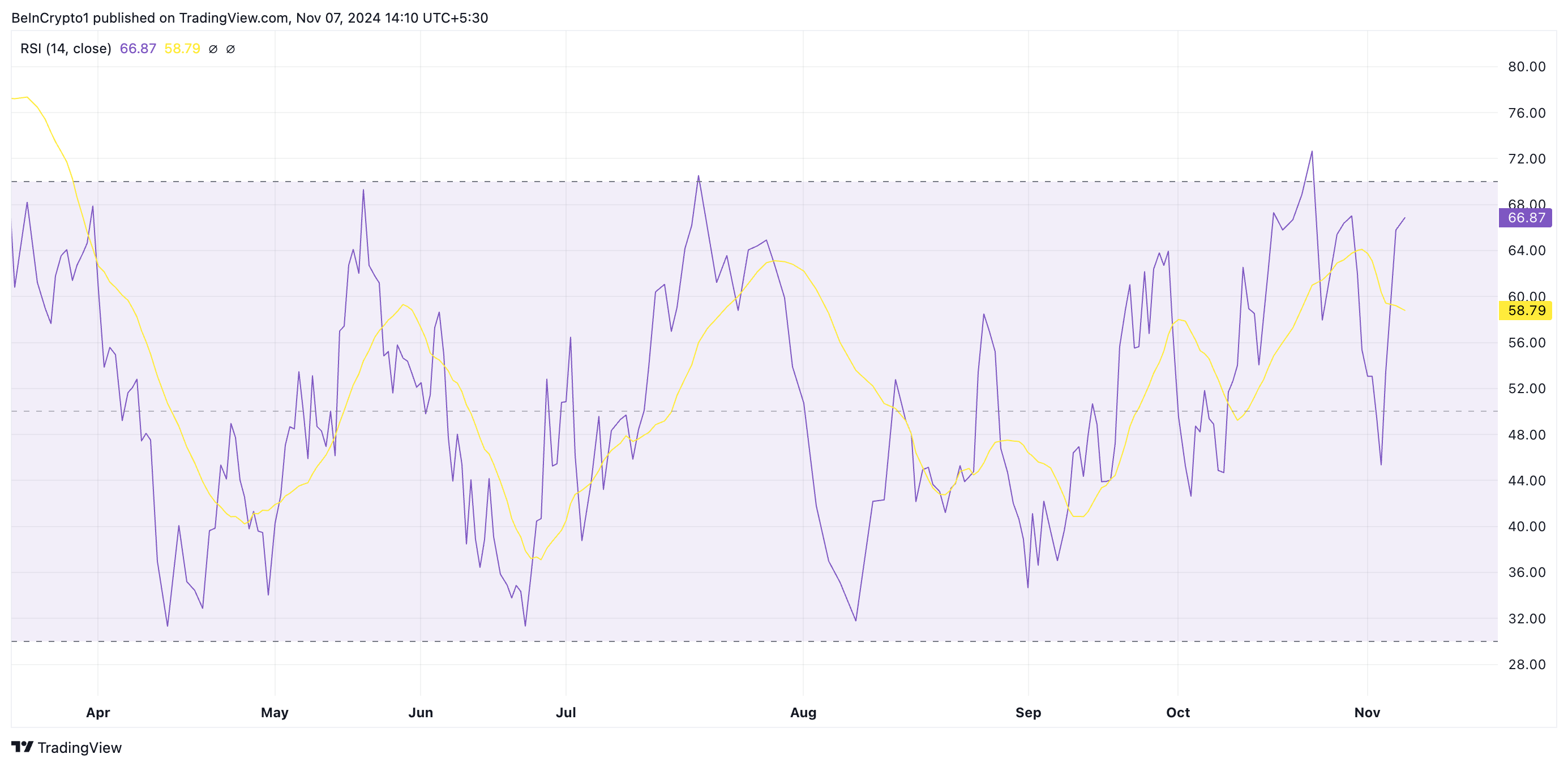 I tillegg støtter Solanas stigende Relative Strength Index (RSI) dette bullish utsiktet. I skrivende stund er indikatorens verdi 66,87.