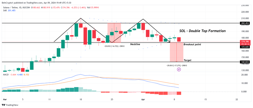 Solanas pris, som handles til $ 174 i skrivende stund, er nær å falle gjennom støtten på $ 172, noe som kan resultere i at altcoin validerer den doble toppformasjonen.
