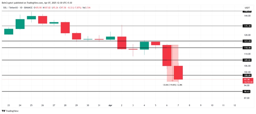 Solanas (SOL) kurs falt under $ 100-merket i dag for å handle til $ 97 etter å ha notert et fall på 20 % de siste 24 timene. “Ethereum-dreperen” står overfor intens bearishhet fra det bredere markedet som følge av Trumps tollkriger og frykt for en ny “Black Monday.” SOL fulgte i fotsporene til Bitcoin, som også falt under $ 80 000-merket i dag.