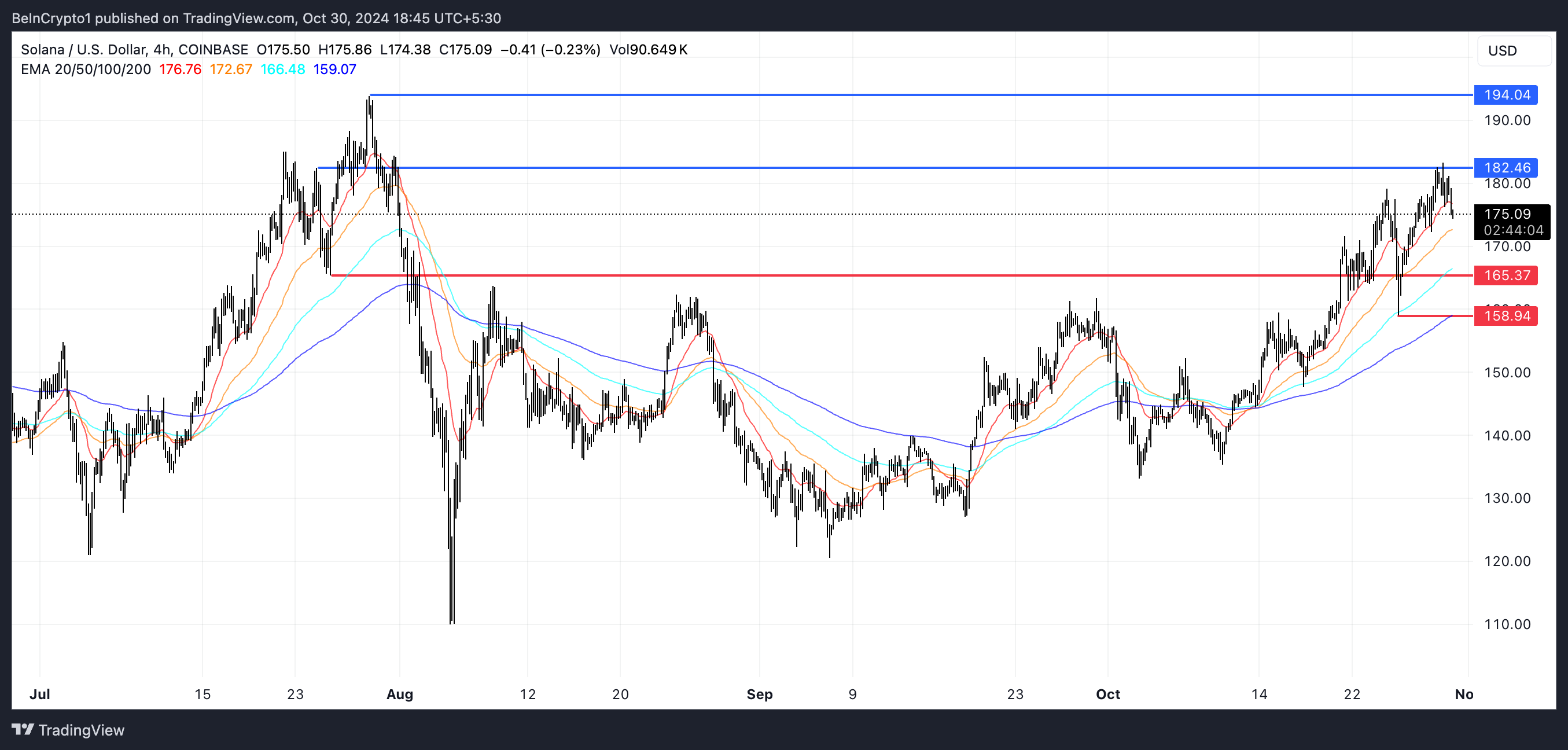 Hvis en nedtrend oppstår, har SOL kurs støttenivåer på $ 165 og $ 158,9, noe som antyder en mulig 9 % korreksjon hvis disse nivåene testes. På den annen side, hvis den bullish momentumet gjenvinner styrke, kan SOL teste motstand på $ 182.