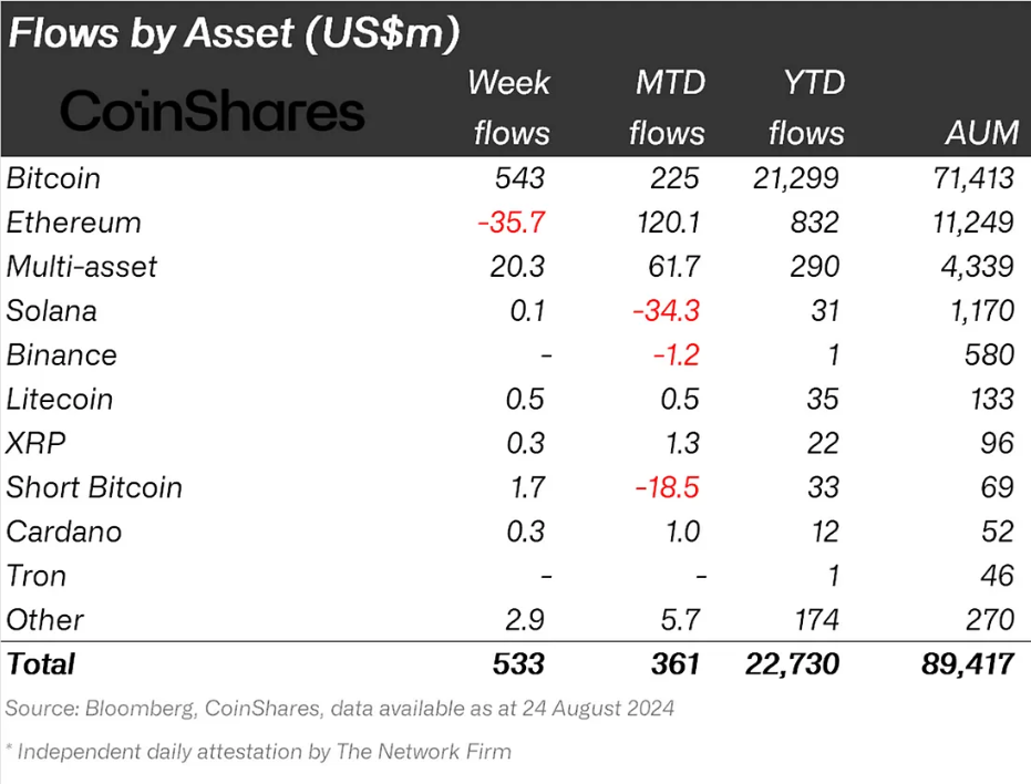 Ifølge rapporten fra CoinShares, så uken som endte 24. august innganger på bare $ 100 000 i SOL. Dette er det laveste av alle aktivaene, med selv Cardano som noterte $ 300 000 i innganger. Som et resultat har SOLs måned-til-dato utstrømninger nådd $ 34 millioner.