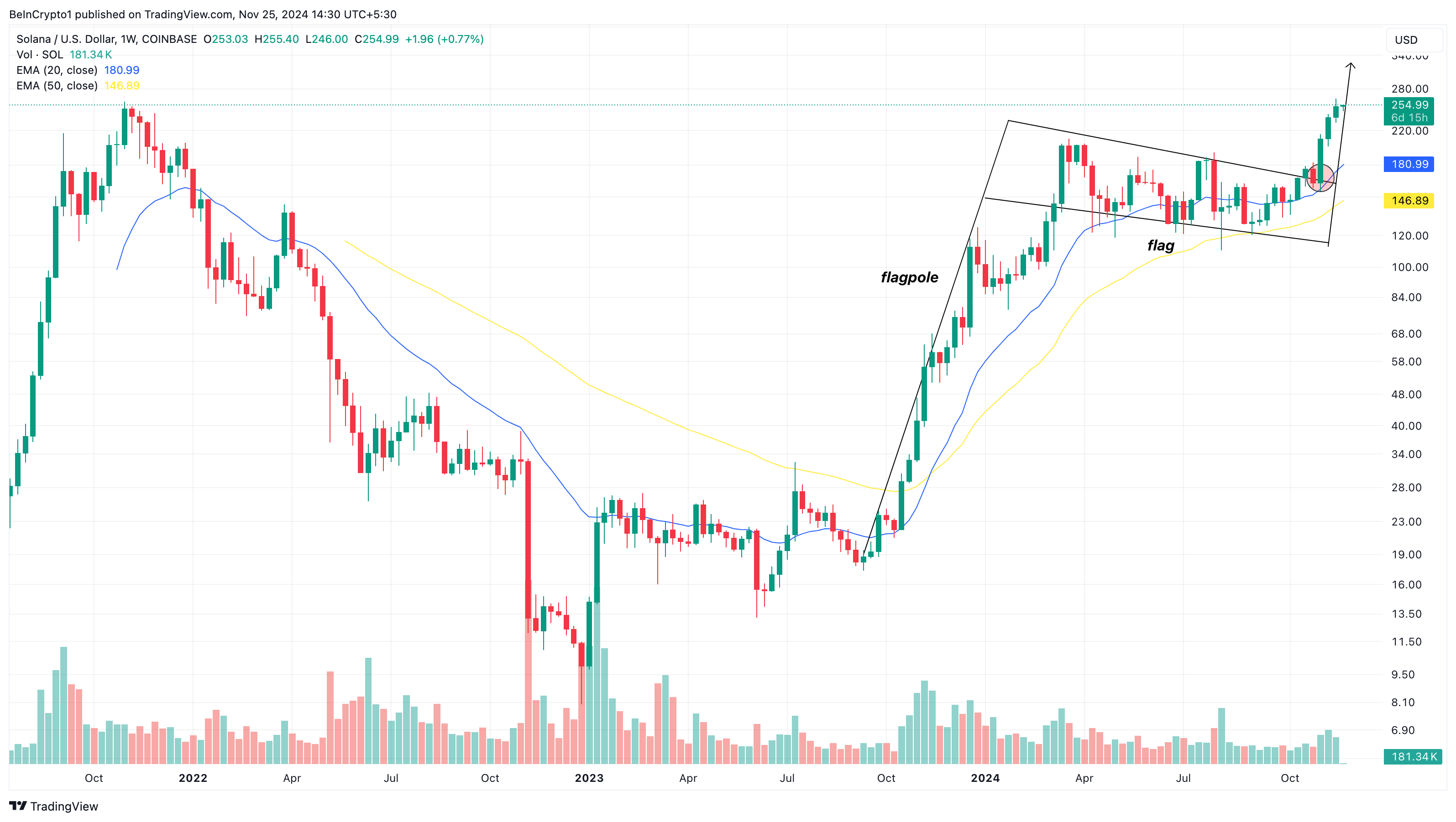 Et bull flag er et fortsettelsesmønster, som indikerer at når prisen bryter ut, er det sannsynlig at den vil opprettholde den tidligere oppadgående momentum. Som vist nedenfor, har SOL allerede brutt ut av konsolideringsmønsteret og er på vei høyere.