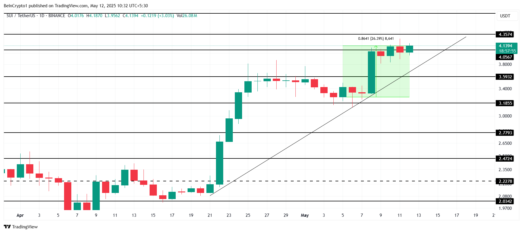 Både SUI og Solana har sett moderat vekst den siste uken, med SOL som stiger 22 % og SUI som øker 26 %. Med en kurs på $ 4,13 forsøker SUI å sikre $ 4,05 som støttenivå etter en måneds lang opptrend. Manglende evne til å holde dette nivået kan indikere utfordringer med å opprettholde veksten.