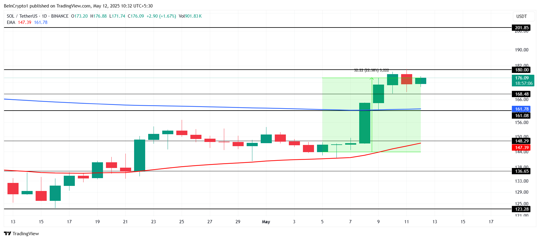 I mellomtiden handles Solana til $ 176 og er på nippet til å avslutte sin pågående Death Cross. Imidlertid har prisen ikke klart å bryte den kritiske motstanden på $ 180, som er nødvendig for å nå $ 200. Inntil dette nivået er overvunnet, kan Solana slite med å gjenvinne full bullish momentum.