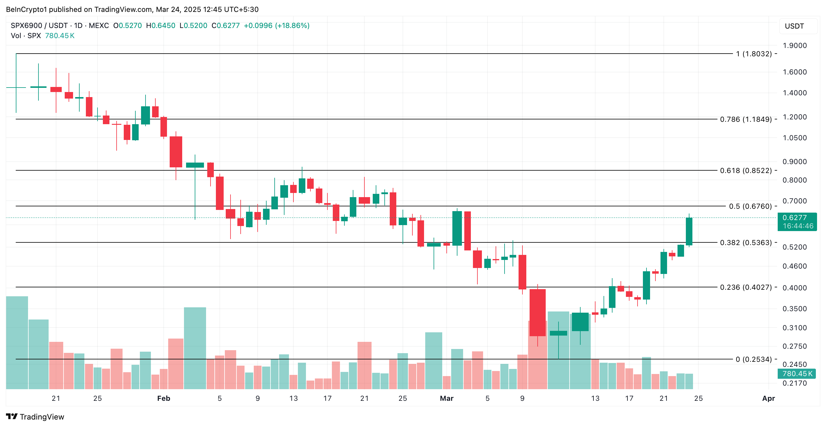 • SPX stiger 148 % fra sin laveste verdi på $ 0,25, nå handles til $ 0,62, drevet av økende bullish momentum.