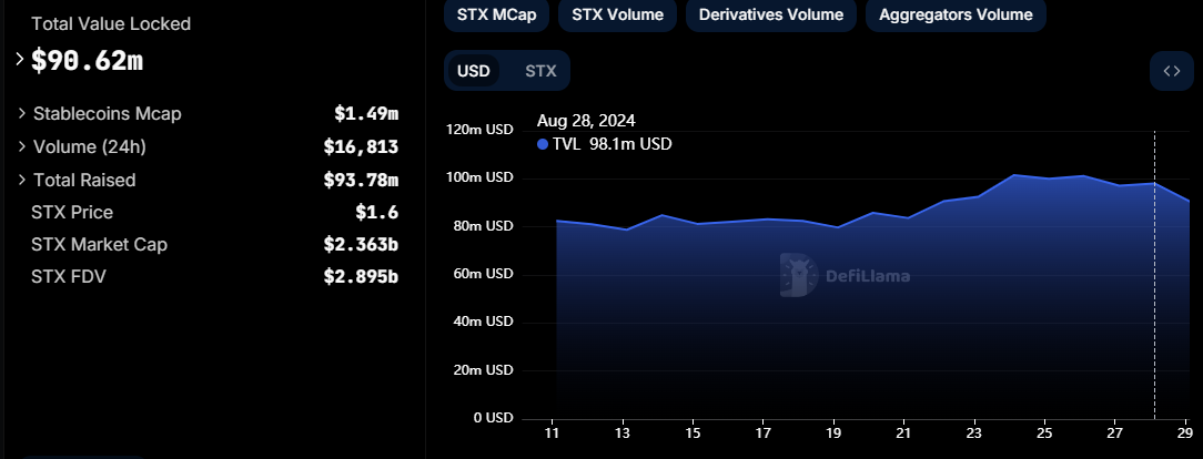 Til tross for de positive endringene som oppgraderingen, som startet på onsdag, har medført, har den totale verdien låst (TVL) på Stacks-nettverket redusert med over $ 7 millioner, fra $ 98,10 millioner til $ 90,62 millioner. Denne nedgangen i TVL antyder at oppgraderingens umiddelbare innvirkning på markedstilliten var blandet, selv om nettverket gjennomgår bemerkelsesverdige forbedringer.