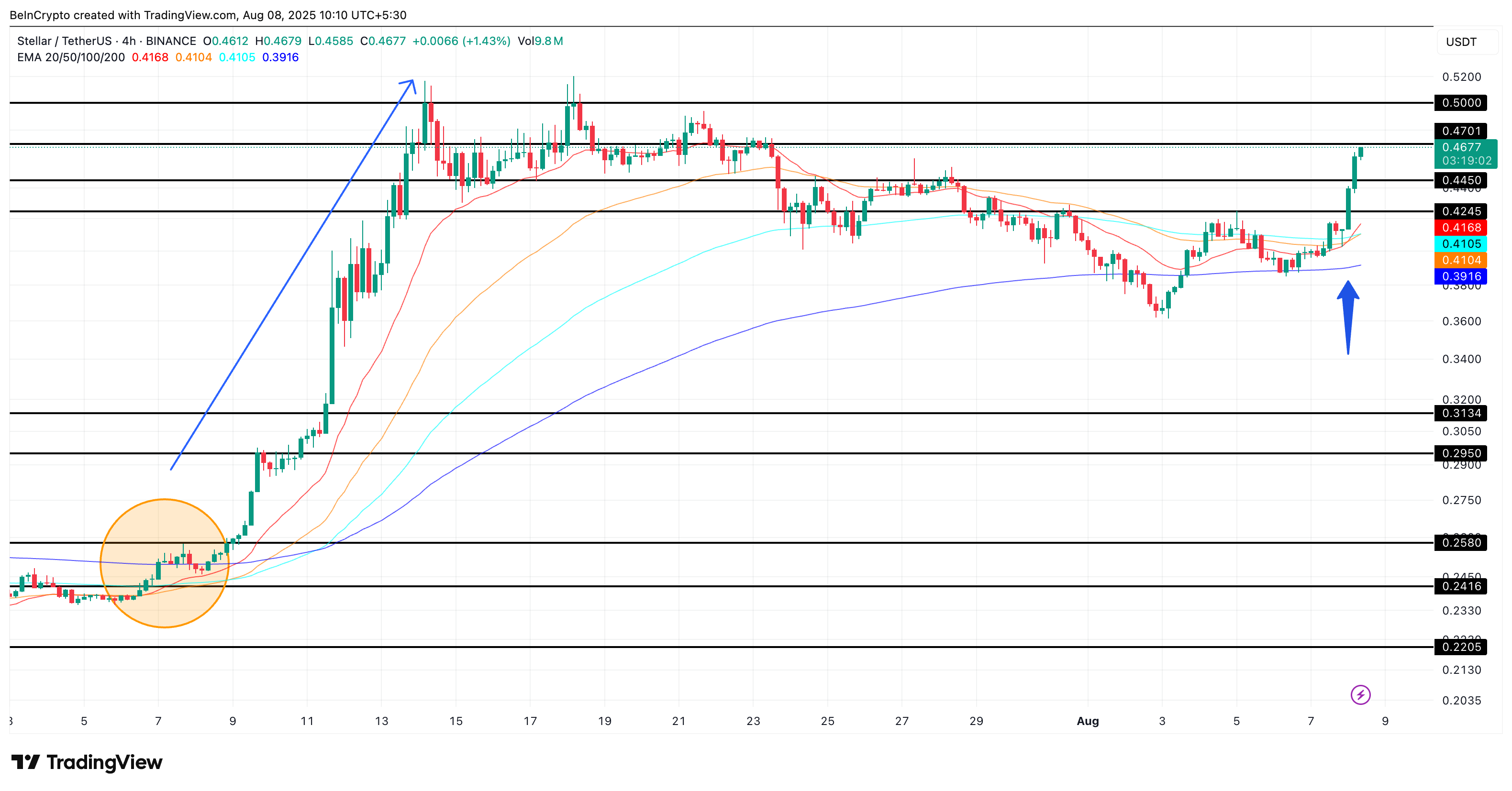 Historisk sett, sist gang denne tredobbelte kryssingsoppsettet skjedde (tidlig i juli), Stellar kurs hoppet fra $ 0,23 til over $ 0,52; en oppgang på 122 %, sånn omtrent. Dette oppsettet bygger sterk teknisk momentum ettersom prisen for øyeblikket presser over $ 0,46, med $ 0,50 som umiddelbar psykologisk motstand og $ 0,52–$ 0,97 som den bullish utvidelsessonen.