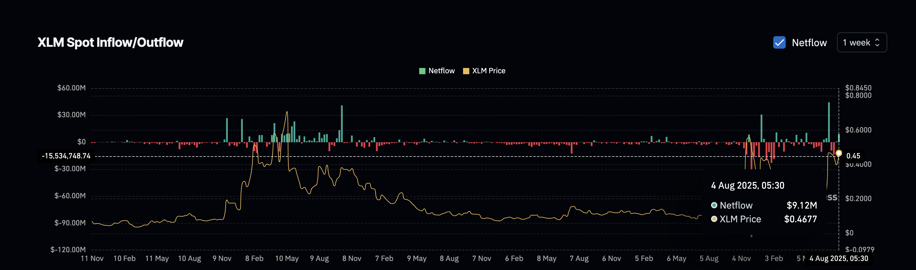 En ukes spotbørs netflow-diagram viser et hopp fra bare $ 724 000 forrige uke til $ 9,12 millioner denne uken; en økning på over 1 159 %. Denne metrikken sporer hvor mye XLM som flyter inn på eller ut av børser. Når flytene øker, signaliserer det vanligvis at tradere flytter tokens til børser for potensielt å selge.