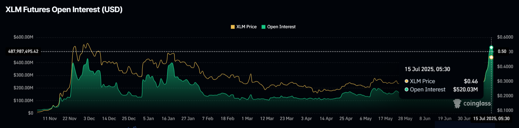 Stellars futuresmarkedaktivitet har økt, med Futures Open Interest som har nådd en rekordhøyde på $ 520 millioner de siste 24 timene. Dette indikerer at tradere er stadig mer interessert i derivatene av aktivaen, som utnytter dens oppgang.