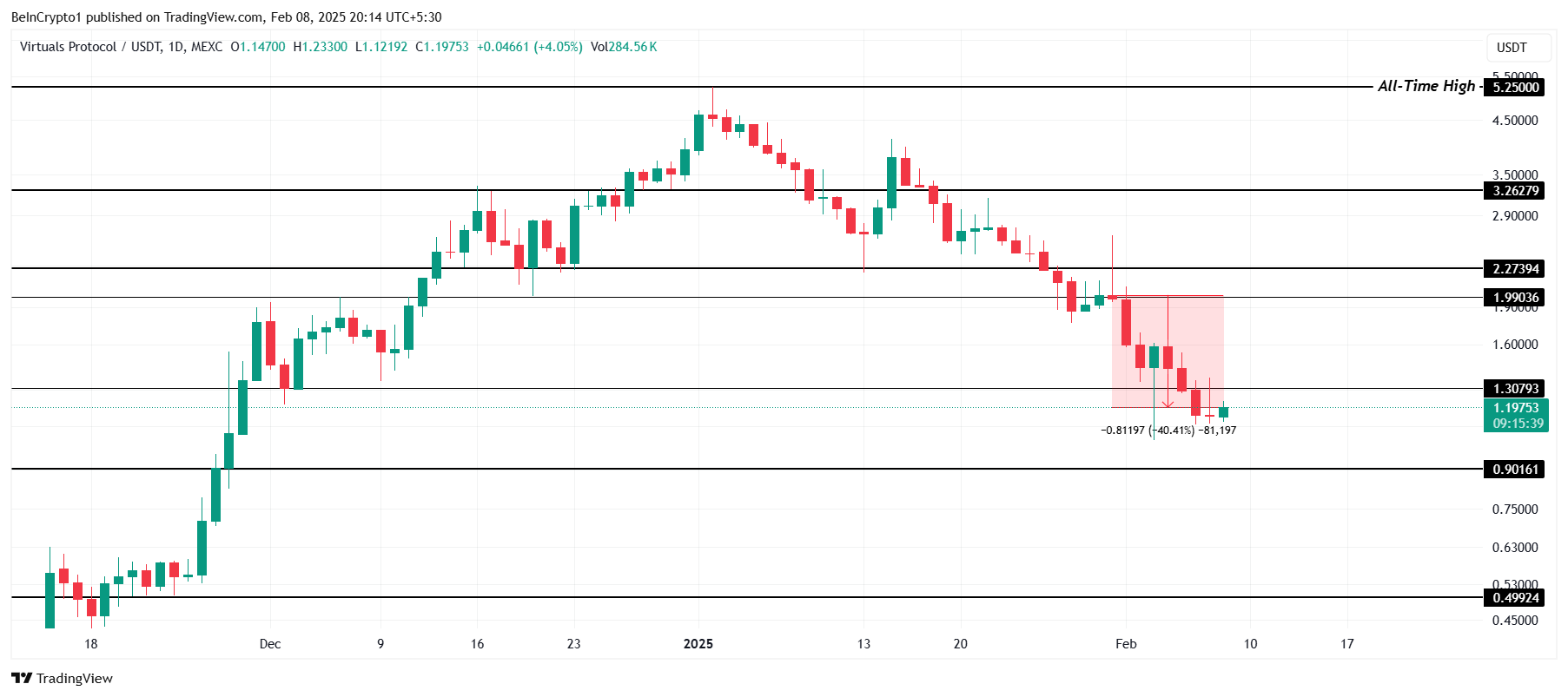 VIRTUAL har lidd en betydelig nedgang på 40 %, og er den dårligst ytende kryptovalutaen denne uken. Tokenet handles for øyeblikket til $ 1,19 etter å ha mistet sin avgjørende støtte på $ 1,30. Dette kraftige fallet har intensivert salgspresset, og uten en reversering kan VIRTUAL møte ytterligere nedgang på kort sikt.