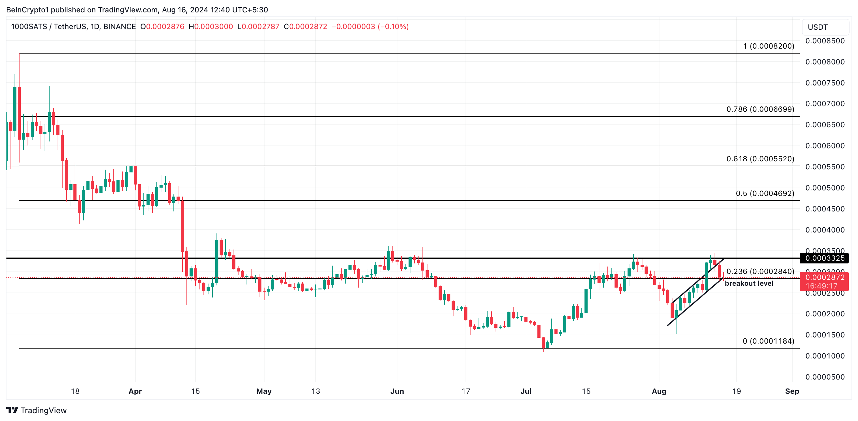 En dags diagramanalyse viser at 1000SATS handlet innenfor en stigende kanal, som den brøt over den 12. og 13. august. Dette mønsteret, dannet av to oppadgående parallelle linjer, er vanligvis et bullish signal, der den øvre linjen representerer motstand og den nedre linjen indikerer støtte.