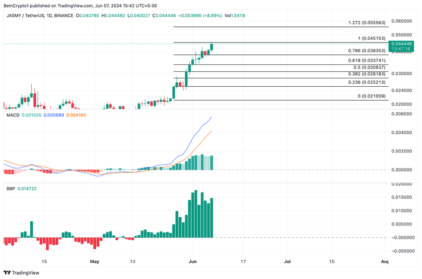 I løpet av de siste syv dagene har prisen per JasmyCoin (JASMY) steget med 46%. Altcoin bytter hender til $ 0.043 ved pressetiden, og handles for tiden på et prisnivå som sist ble observert i mars 2022.