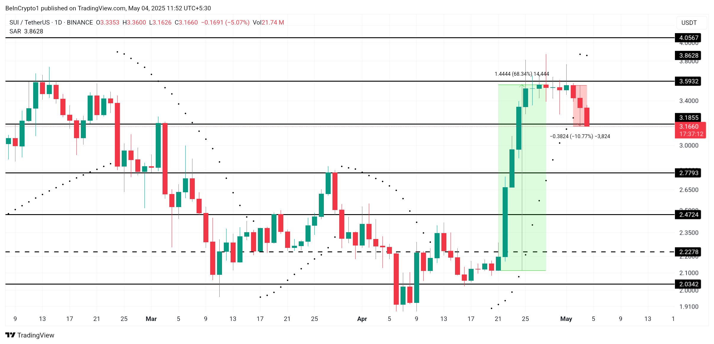 I skrivende stund handles SUI til $ 3,16, etter å ha falt under et viktig støttenivå i løpet av de siste 24 timene. Nedgangen på 10,77 % skyldes altcoinens manglende evne til å bryte $ 3,59 motstandsnivået, forsterket av en generell markedsavkjøling. Likevel blir korreksjonen sett på av mange tradere som midlertidig.