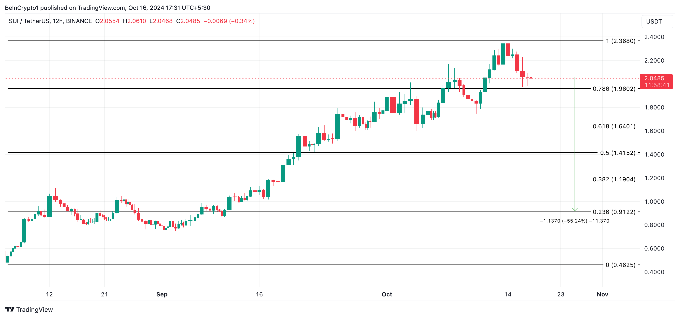 SUI, den opprinnelige mynten til Layer-1 (L1) blokkjeden Sui Network, nådde en historisk høyde på $ 2,36 den 14. oktober. Imidlertid, ettersom aktiviteten for gevinstsikring tar fart, har SUI startet en nedadgående trend.