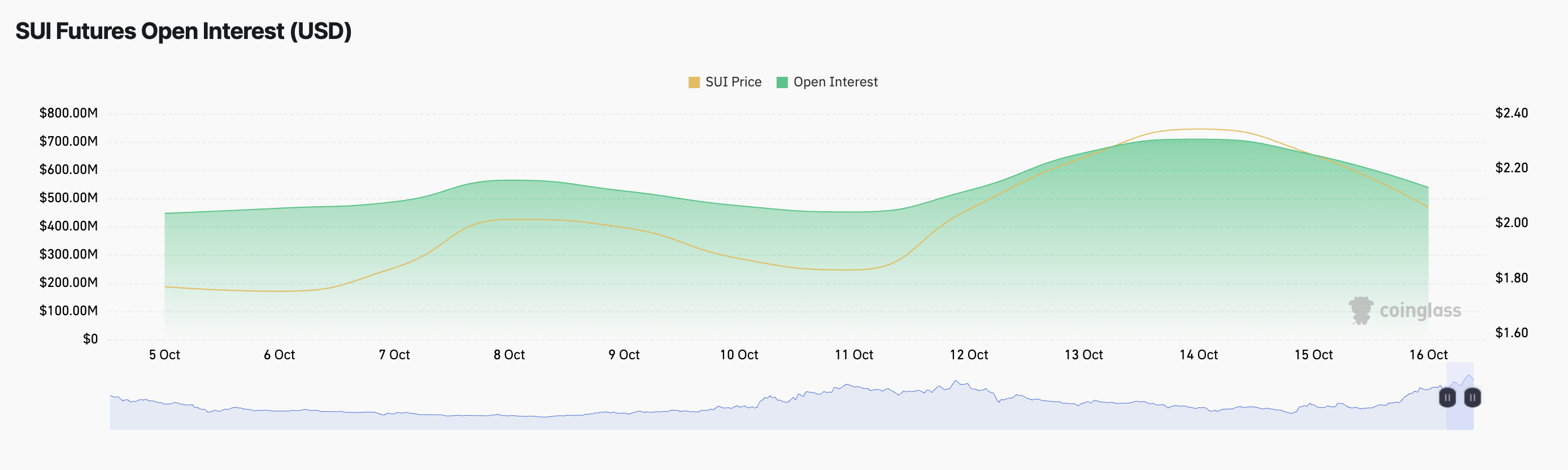 SUIs fallende åpen interesse er en annen sterk indikator på redusert interesse for altcoinen. Etter å ha nådd en historisk høyde på $ 709 millioner den 14. oktober, har åpen interesse jevnt trendet nedover, noe som signaliserer at færre tradere opprettholder aktive posisjoner i SUI. Den har falt med 24 % på bare to dager, nå til $ 538 millioner.