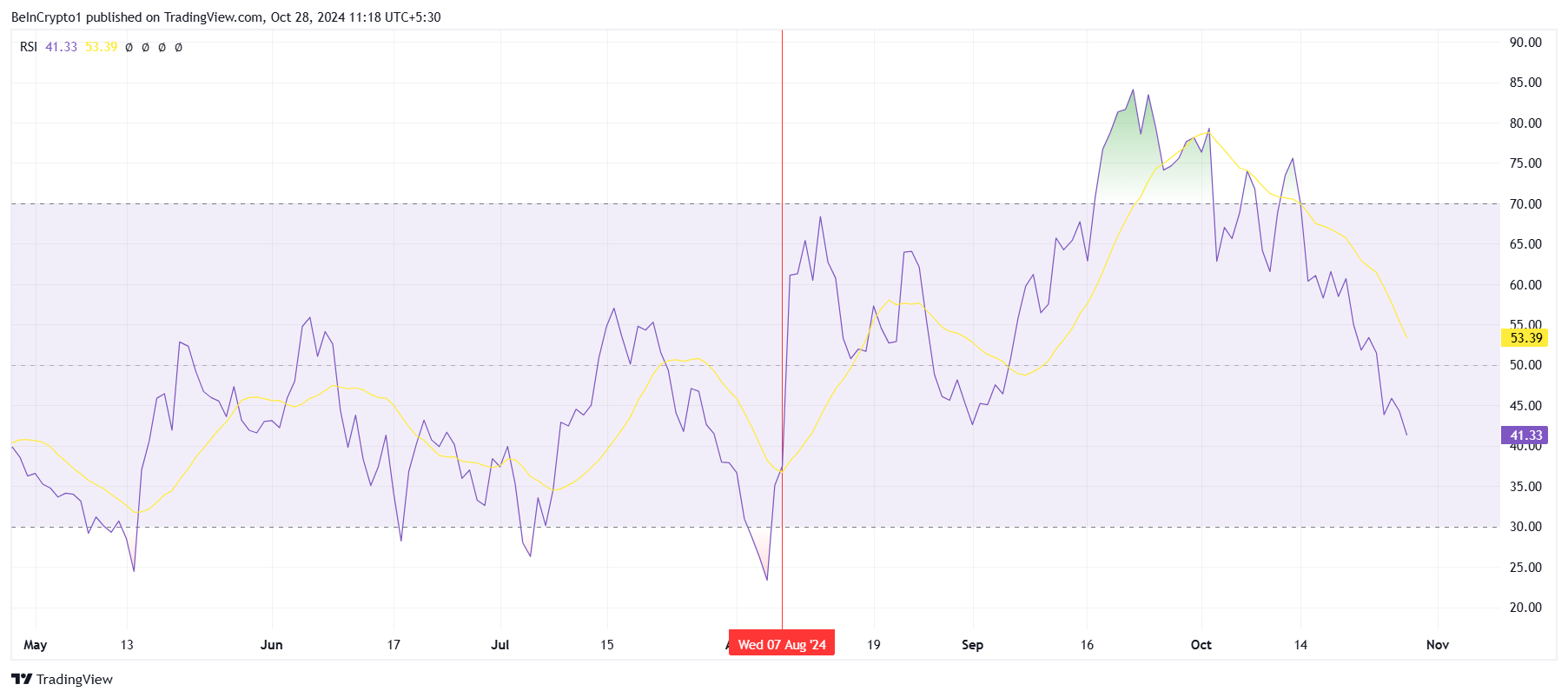 SUIs makromomentum reflekterer en dypere bearish trend, fremhevet av tekniske indikatorer som Relative Strength Index (RSI). For øyeblikket, på et to og et halvt måneds lavpunkt, har RSI falt under det nøytrale nivået på 50, noe som indikerer at altcoinens prisbevegelser svekkes. En lav RSI etter en jevn nedgang signaliserer ofte en styrking av bearish momentum, noe som kan legge ytterligere press på SUIs pris.