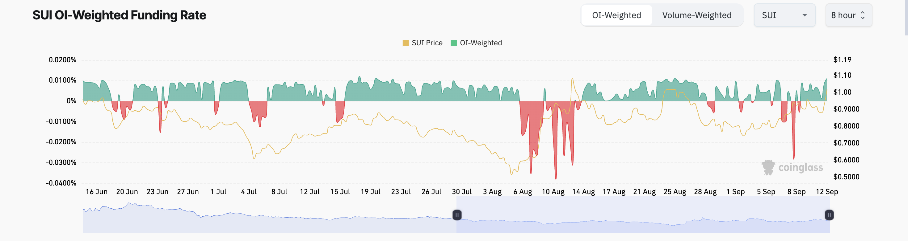 SUIs positive finansieringsrate tyder på at mange av disse traderne satser på en fortsatt prisoppgang. Myntens finansieringsrate, som er en periodisk avgift betalt for å sikre at kontraktsprisen holder seg nær spotprisen, er på 0,0086 % i skrivende stund. Det signaliserer at det er en høyere etterspørsel etter long-posisjoner blant markedsdeltakerne enn short-posisjoner.