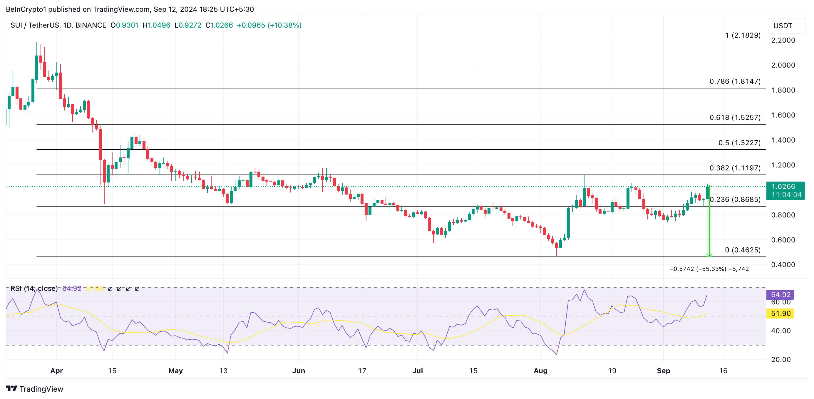 SUIs stigende Relative Strength Index (RSI) støtter den bullish utsikten som er fremhevet ovenfor. Indikatoren, som måler en aktivas overkjøpte og oversolgte markedsforhold, er i en oppadgående trend på 64,92 i skrivende stund.