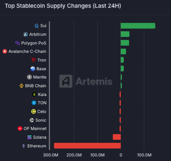 På samme måte viser data fra Artemis at på tirsdag ledet Sui Network alle blokkjeder i innstrømninger av stablecoins de siste 24 timene. Spesielt oversteg den totale stablecoin-forsyningen på nettverket $ 1 milliard.