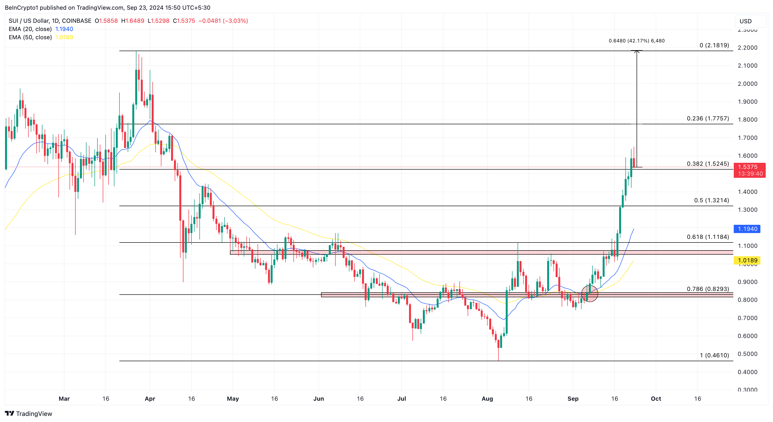 På det daglige diagrammet møtte SUI-okser utfordringer i sitt nylige forsøk på å nå $ 1.54. Da prisen nærmet seg $ 0.83, møtte den motstand som opprinnelig sikret å trekke den tilbake. Imidlertid krysset 20-dagers eksponentiell glidende gjennomsnitt (EMA) over 50-dagers EMA på dette tidspunktet, noe som signaliserte en bullish trend.