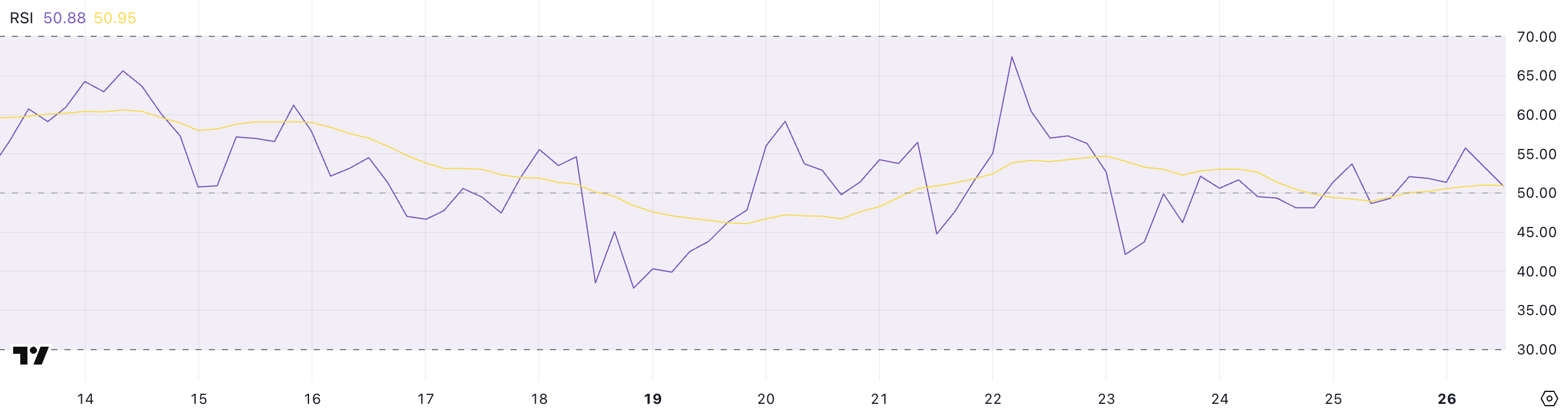 RSI er en momentumoscillator som varierer fra 0 til 100, med verdier over 70 som indikerer overkjøpte forhold og under 30 som signaliserer oversolgte forhold. En RSI nær 50 reflekterer vanligvis balanse mellom kjøps- og salgspress—som antyder at markedet er i likevekt.