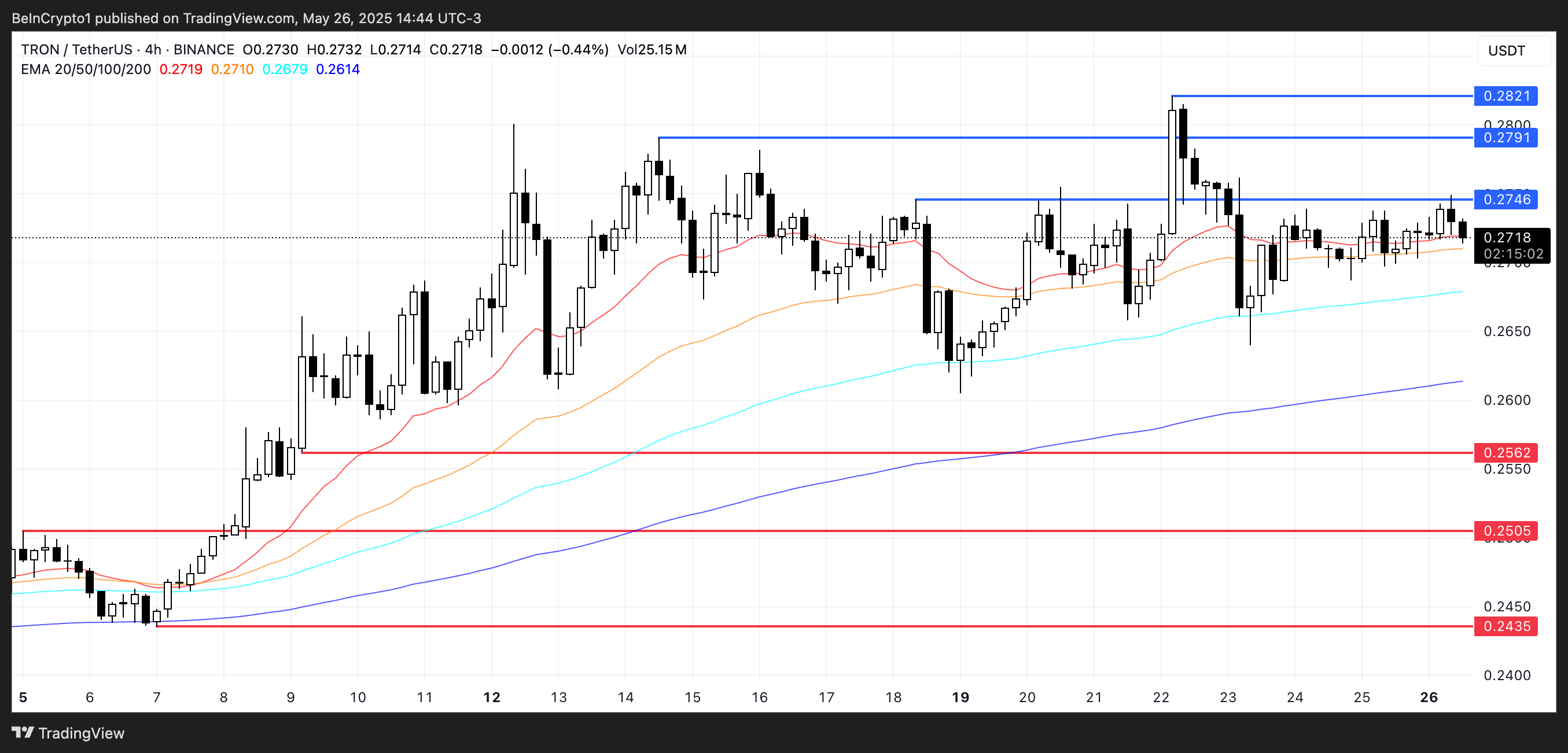 Tron har handlet jevnt rundt $ 0,27-nivået den siste uken, med sine EMA-linjer som peker på pågående konsolidering.