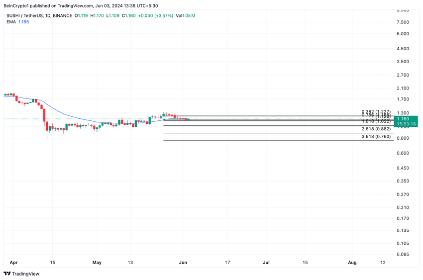 Dette har spilt ut i SUSHIs tilfelle, ettersom altcoin-verdien har steget med 5% siden den nådde bunnen på $ 1.11 i løpet av handelssesjonen 2. juni. I skrivende stund byttet SUSHI hender til $ 1.16.