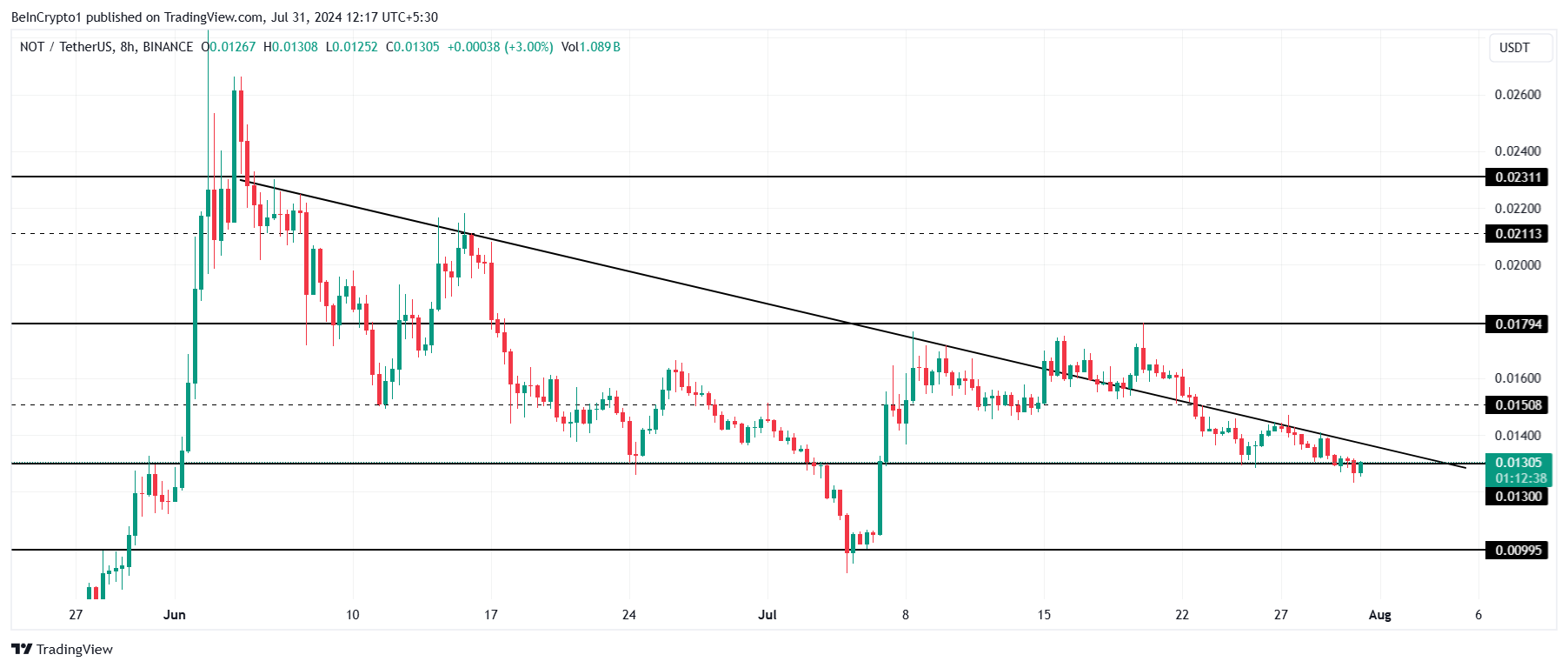 Notcoins kurs har falt 25 % de siste ti dagene, og nådd $ 0,013. Ved å gjøre dette mislyktes Telegram-mynten i å sikre et gjennombrudd fra nedtrendlinjen den har vært under siden begynnelsen av juni.