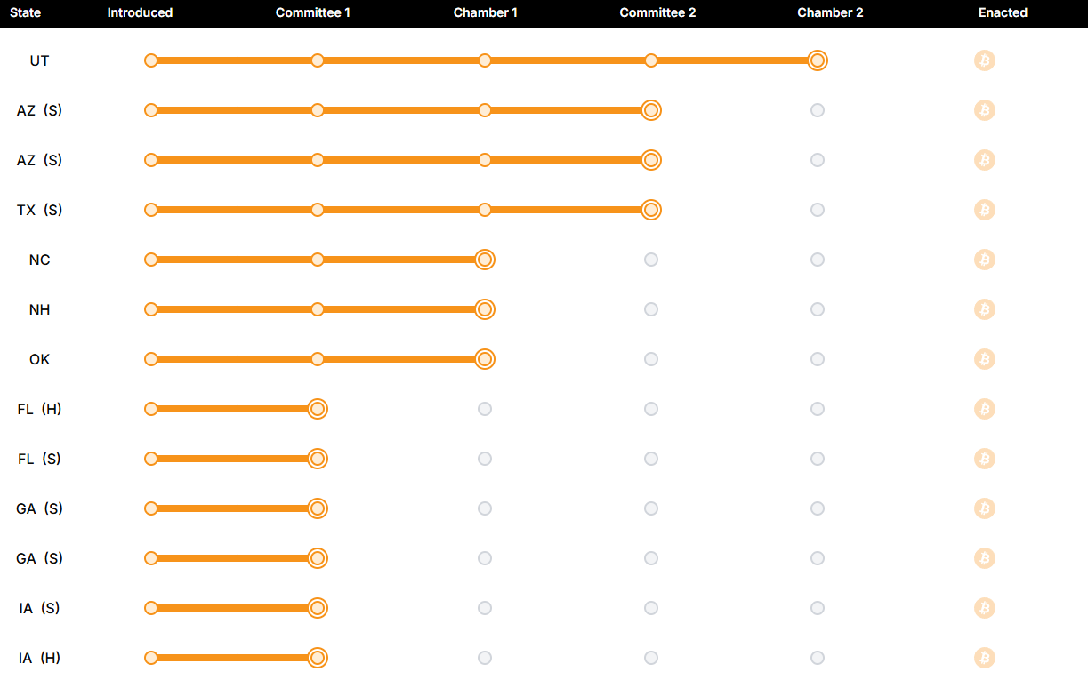 Flere andre statlige reserveforslag mislyktes på grunn av avhopp fra det republikanske partiet. I Texas stemte imidlertid de fleste demokrater for. Dette lovforslaget utløser foreløpig ikke obligatoriske Bitcoin-kjøp, noe som var et stort stridspunkt med finanskonservative.