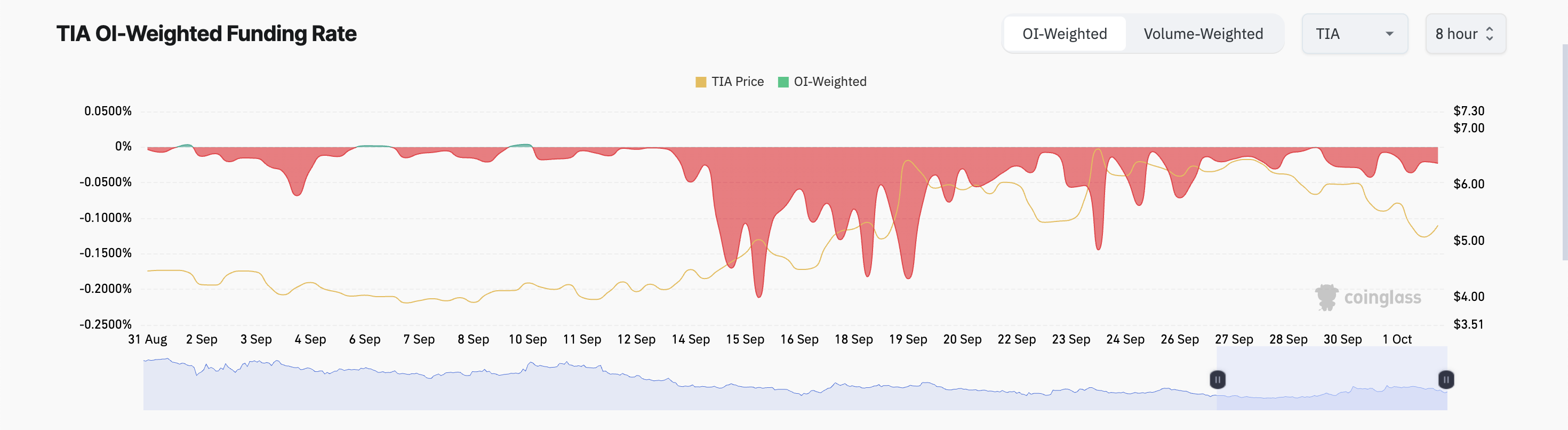 I tillegg reflekterer TIAs negative finansieringsrate den bearish biasen. Den står på -0,022 % i skrivende stund, noe som indikerer at futures tradere satser på dens fortsatte prisfall.