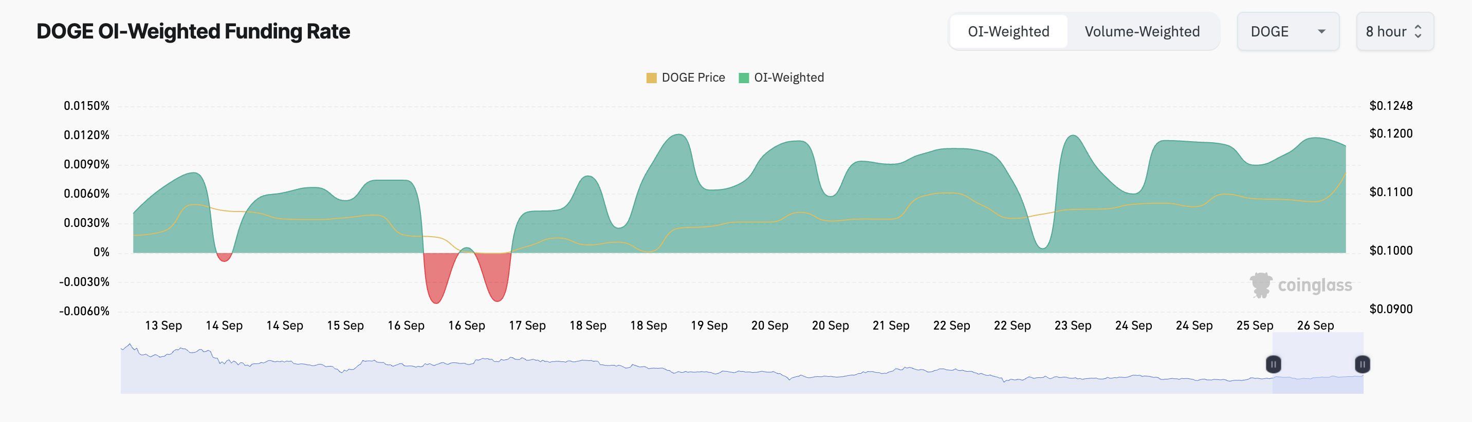 Siden 17. september har mynten kun hatt positive finansieringsrater, noe som indikerer en vedvarende etterspørsel etter long-posisjoner. Dette er et bullish signal fordi det skaper en selvforsterkende syklus der flere tradere kommer inn på markedet fordi de tror at myntens pris vil vokse — en følelse som til slutt driver prisene enda høyere. I skrivende stund er meme coins finansieringsrate 0,01 %.