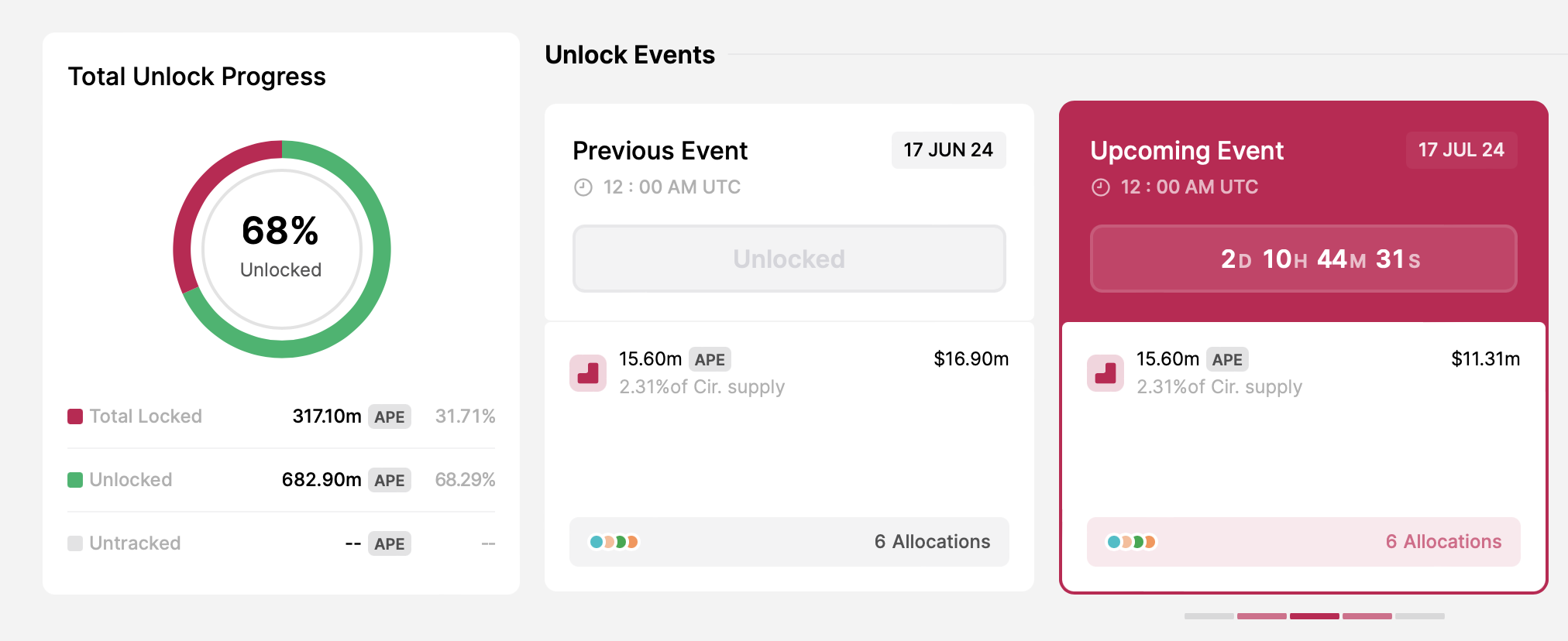 Vanligvis opplever APE et prisfall etter store opplåsinger. Investorer og tradere bør være oppmerksomme på denne hendelsen, da det kan ha alvorlig innvirkning på tokenets dynamikk.