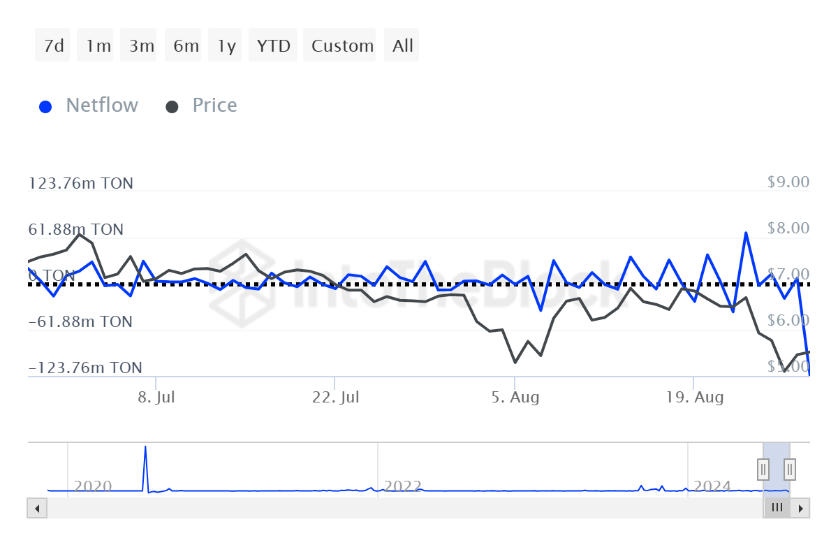 Spikes i de aktive innskuddsmetrikene viser at bevegelsen av TON fra investorers lommebøker til børsene økte. Dette er et tegn på skepsis og bearishness blant investorer som kunne føre til salg, og det gjorde det.