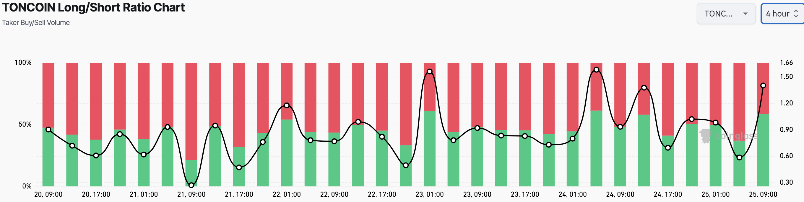 En økning i OI antyder ofte flere kjøpere enn selgere, men det er ikke alltid tilfelle. I dette tilfellet indikerer den betydelige økningen at tradere i økende grad engasjerer seg i kontrakter knyttet til Toncoin, noe som reflekterer økt markedsaktivitet og interesse.